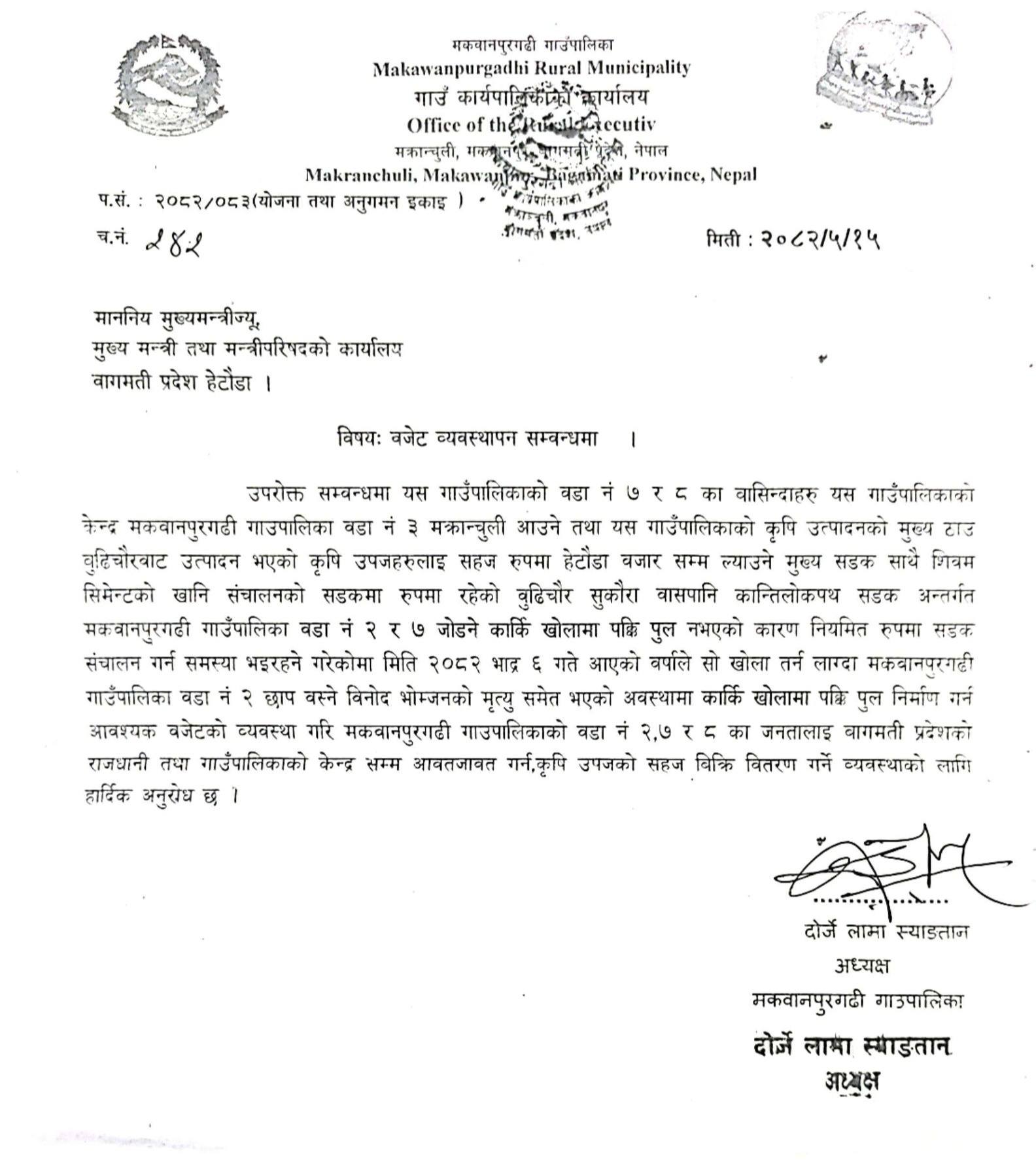 हेटौँडा । मकवानपुरगढी गाउँपालिका–७ का वडा अध्यक्ष सुर्यबहादुर रुम्बा र वडा नं २ का अध्यक्ष बखानसिंह पाख्रिनले गाउँपालिका भित्रको गैरिभन्ज्याङ–बासपानी–सुकौरा सडकखण्डस्थित कार्किखोलामा पक्की पुल निर्माणका लागि बागमती प्रदेशका मुख्यमन्त्री इन्द्रबहादुर बानियाँ समक्ष मागपत्र बुझाएका छन्।