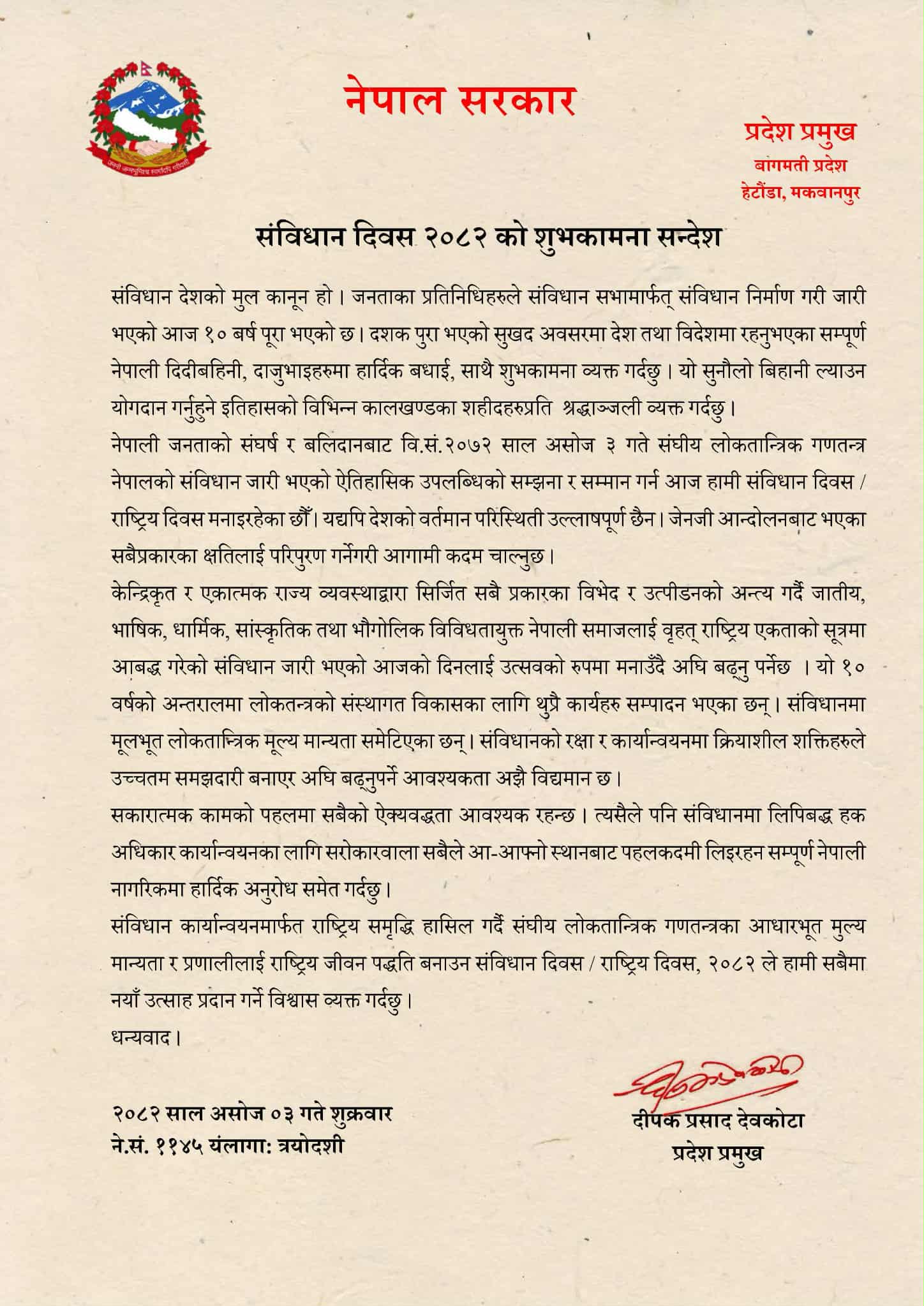 हेटौँडा । बागमती प्रदेश प्रमुख दीपक प्रसाद देवकोटाले संविधान दिवस–२०८२ को अवसरमा सम्पूर्ण नेपाली दाजुभाइ तथा दिदीबहिनीलाई शुभकामना व्यक्त गरेका छन् ।