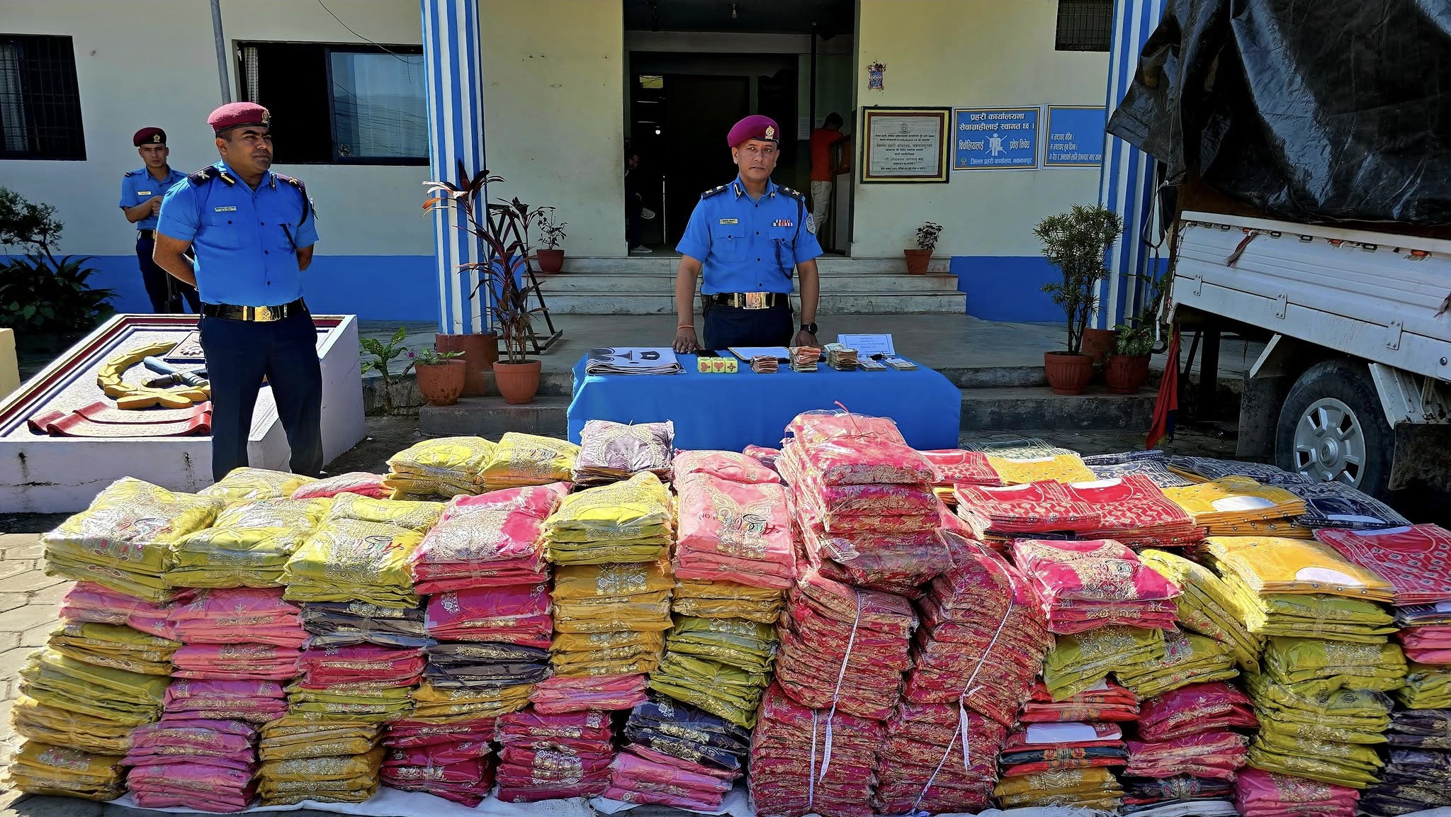 गाडीको पछाडिको ढालाभित्र लुकाइ–छिपाई ल्याइएका सामानमध्ये साडी १३० थान, कुर्ता ६९६ थान, टप्स १७५ थान गरी जम्मा १,००१ थान कपडा बरामद गरिएको छ, जसको मूल्य करिब १४ लाख रुपैयाँ बराबर रहेको प्रहरीले जनाएको छ।