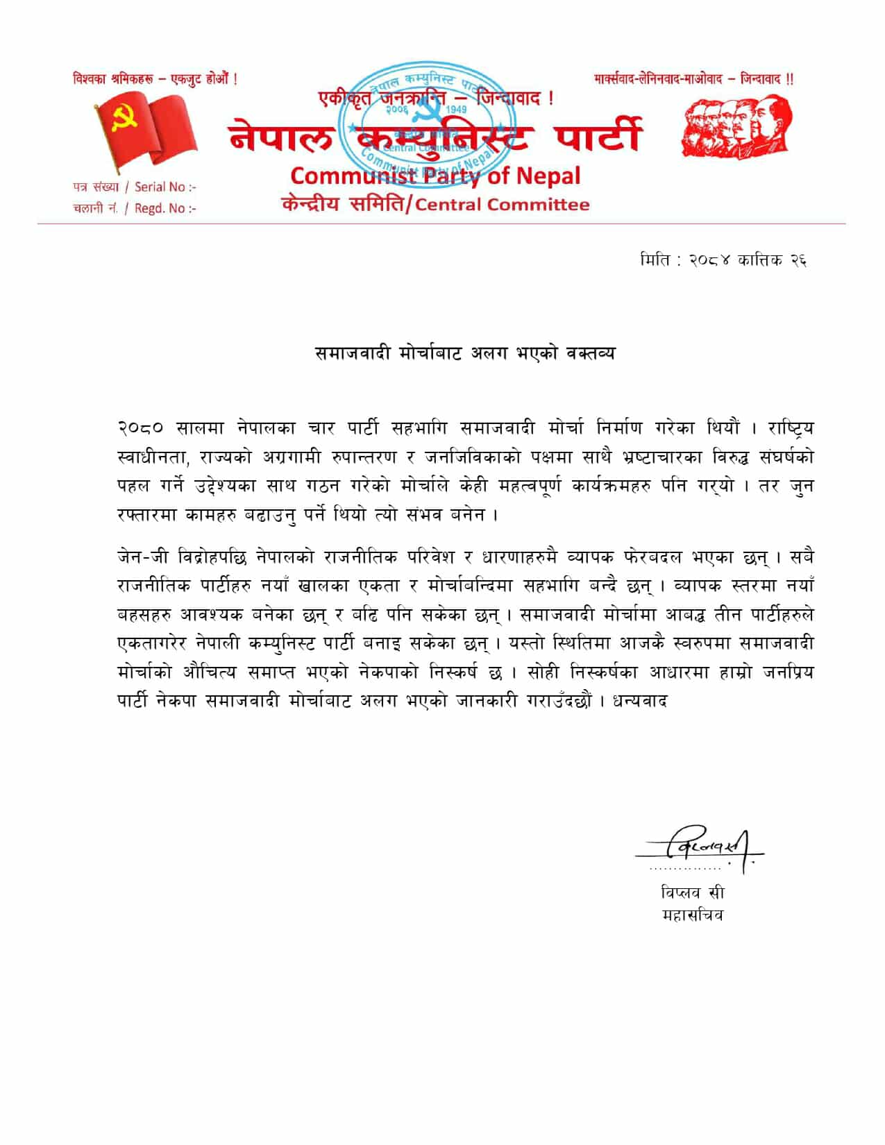 विप्लवले भनेका छन् जेनजी विद्रोहपछि नेपालको राजनीतिक परिवेश र धारणाहरूमै व्यापक फेरबदल र सबै नयाँ खालका एकता र मोर्चाबन्दमा सहभागी बन्दै छन् । आजकै स्वरूपमा समाजवादी मोर्चाको औचित्य समाप्त भएको नेकपाको निष्कर्ष छ । सोही निष्कर्षका आधारमा हाम्रो जनप्रिय पार्टी नेकपा समाजवादी मोर्चाबाट अलग भएको जानकारी गराउँदछौ ।