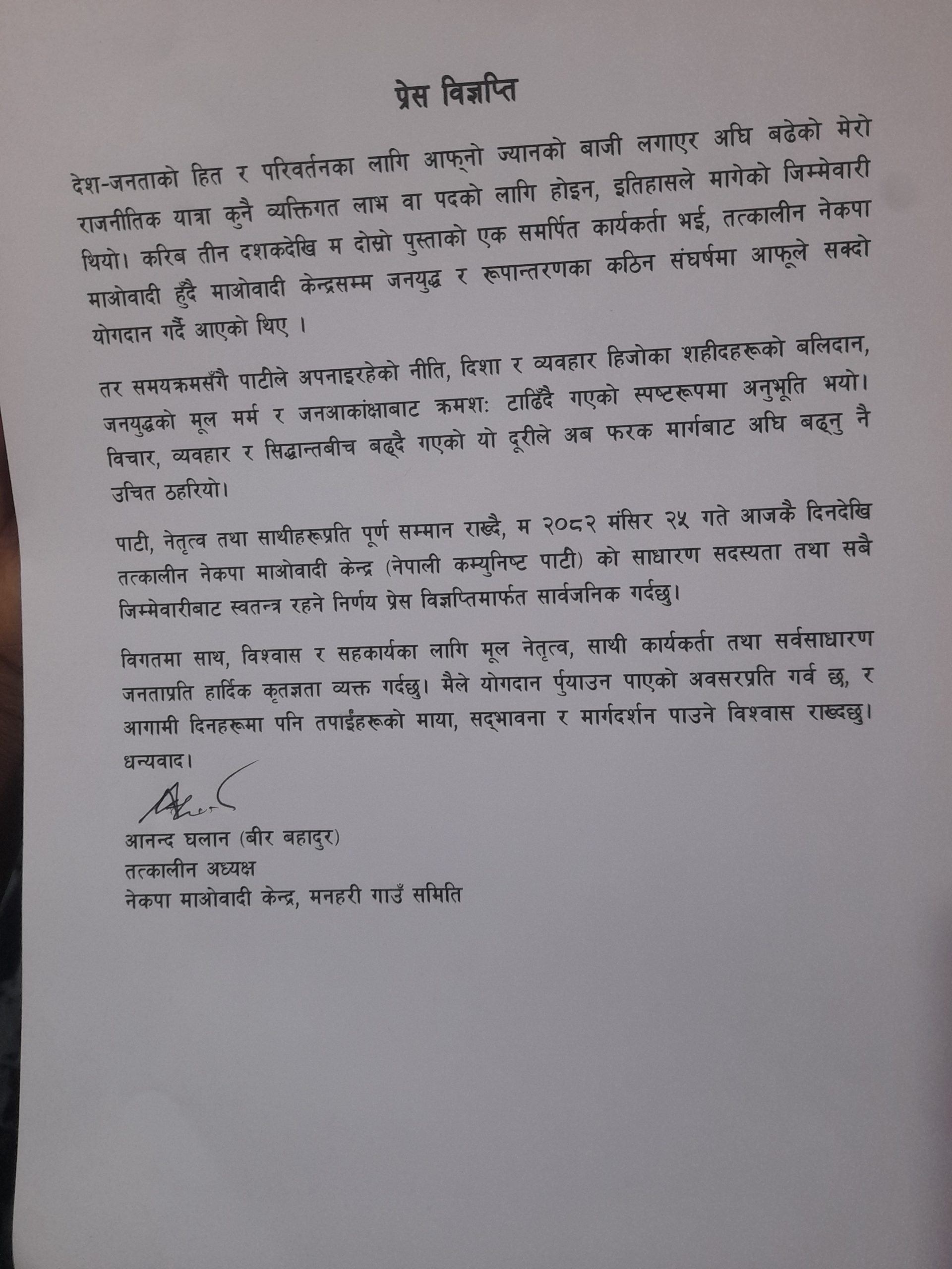 घलानले विज्ञप्तिमा भनेका छन्, म २०८२ मंसिर २५ गतेदेखि तत्कालीन नेकपा माओवादी केन्द्र (नेपाली कम्युनिष्ट पार्टी) को साधारण सदस्यता तथा सबै जिम्मेवारीबाट स्वतन्त्र रहने निर्णय सार्वजनिक गर्दछु।’