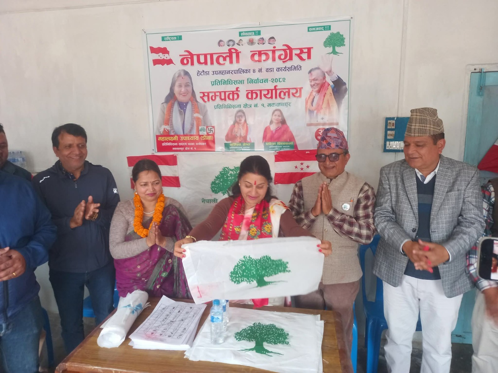 हेटौँडा – आसन्न प्रतिनिधिसभा सदस्य निर्वाचनलाई लक्षित गर्दै नेपाली कांग्रेसले हेटौँडा–४ मा निर्वाचन सम्पर्क कार्यालय उद्घाटन गरेको छ। मंगलबार आयोजित कार्यक्रममा मकवानपुर क्षेत्र नम्बर १ की प्रतिनिधिसभा सदस्य उम्मेदवार महालक्ष्मी उपाध्याय डिनाले कार्यालय उद्घाटन गरेकी हुन्।