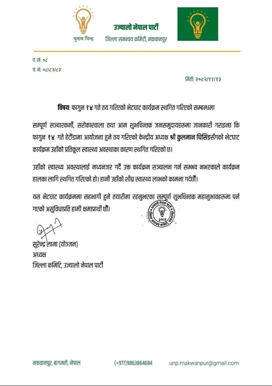 मकवानपुर । उज्यालो नेपाल पार्टीका अध्यक्ष कुलमान घिसिङ स्वास्थ्य समस्याका कारण भोलि (फागुन १४ गते) हेटौंडामा आयोजना हुने आमसभामा सहभागी हुन नसक्ने भएका छन्। पार्टीको चुनावी अभियानअन्तर्गत आयोजना गरिएको उक्त कार्यक्रम स्थगित गरिएको पार्टी स्रोतले जनाएको छ।
