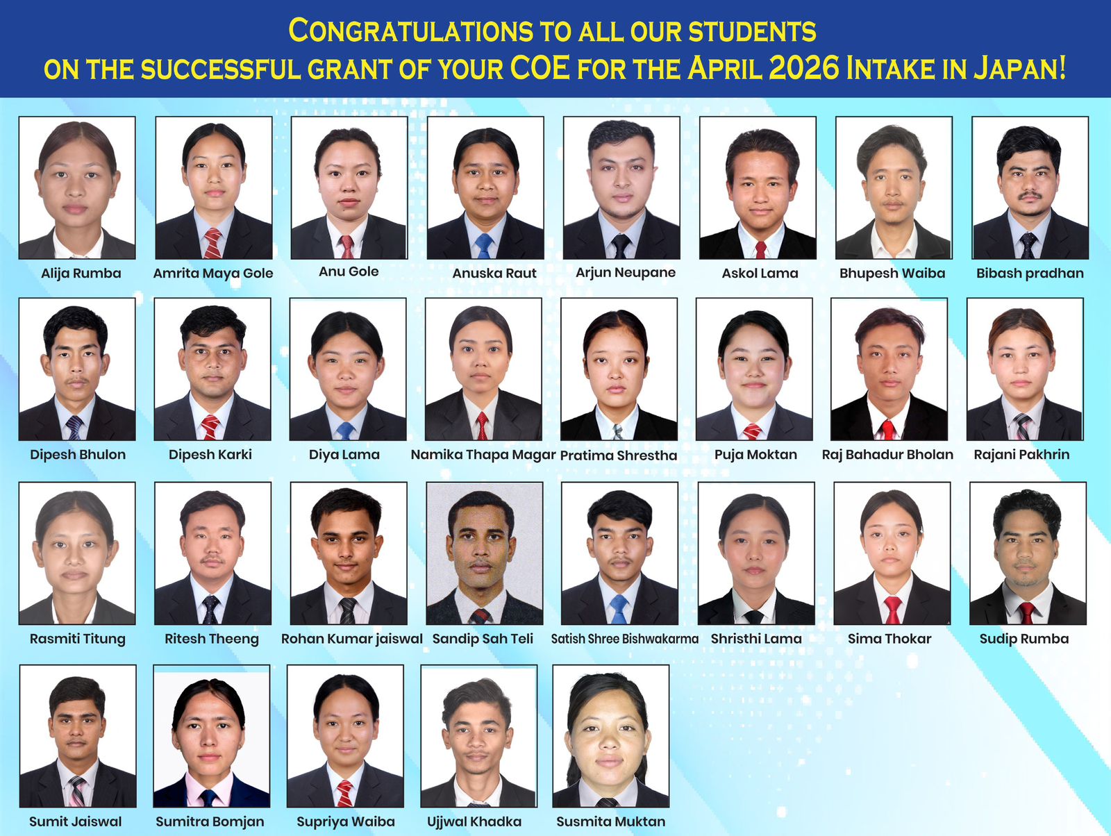 कार्यक्रममा ३० भन्दा बढी भर्ना पुष्टि पत्र (सीओई) प्राप्त गरेका विद्यार्थीहरूलाई बधाई तथा शुभकामना व्यक्त गरिएको संस्थाका सञ्चालक सुरज घलानले जानकारी दिएका छन्।