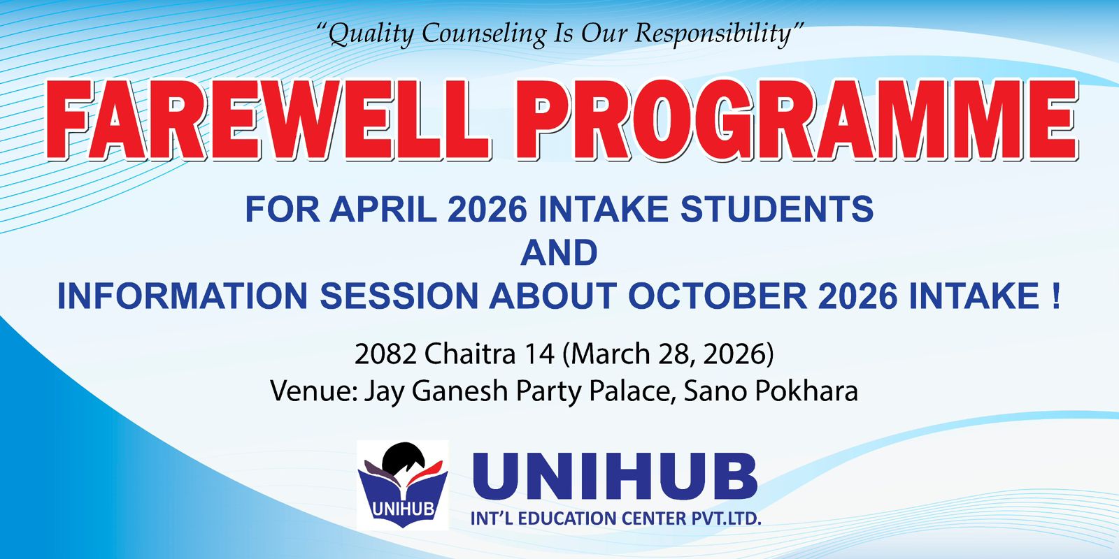 उक्त कार्यक्रमअन्तर्गत अप्रिल २०२६ मा विदेश अध्ययनका लागि जाने विद्यार्थीहरूलाई विदाई प्रदान गरिएको थियो भने आगामी अक्टोबर २०२६ मा विदेश अध्ययनका लागि इच्छुक विद्यार्थीहरूका लागि जानकारीमूलक सत्र सञ्चालन गरिएको थियो। सो क्रममा अध्ययनका लागि आवेदन प्रक्रिया, उपयुक्त देश तथा शिक्षण संस्थाको छनोट, भिसा प्रक्रिया लगायत विषयमा सहभागीहरूलाई विस्तृत जानकारी प्रदान गरिएको थियो।