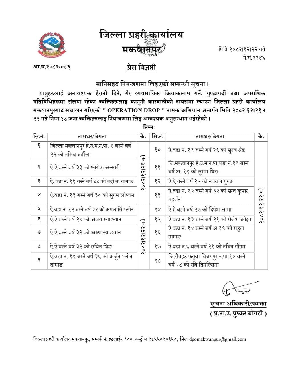 मकवानपुर मा प्रहरीले सञ्चालन गरेको विशेष सुरक्षा अभियान ‘अपरेशन ड्रप’ अन्तर्गत १८ जनालाई नियन्त्रणमा लिइएको छ। जिल्ला प्रहरी कार्यालयले गुण्डागर्दी, अवाञ्छित गतिविधि तथा सर्वसाधारणलाई दुःख दिने कार्यमा संलग्न रहेको आरोपमा उनीहरूलाई पक्राउ गरेको जनाएको छ।