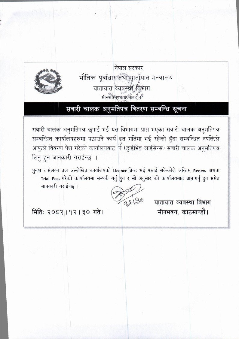 विभागका अनुसार, ट्रायल उत्तीर्ण गरेका वा नवीकरणका लागि विवरण बुझाएका चालकहरूले सम्बन्धित कार्यालयमै गई लाइसेन्स लिनुपर्नेछ। छपाइ भई विभागमा पुगेका लाइसेन्सहरू छिटो वितरण गर्ने कार्य तीव्र गतिमा भइरहेको जानकारी पनि दिइएको छ।