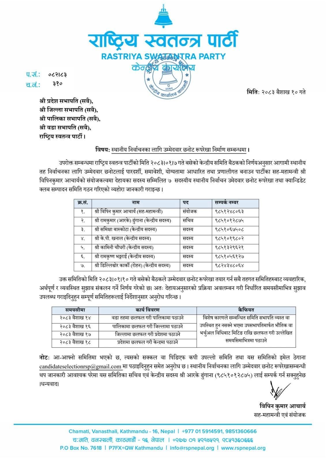 पार्टी केन्द्रीय कार्यालयद्वारा जारी सूचनाअनुसार वैशाख ७ गते बसेको केन्द्रीय समिति बैठकले उम्मेदवार छनोटलाई व्यवस्थित, निष्पक्ष र पारदर्शी बनाउन विशेष समिति गठन गर्ने निर्णय गरेको हो। उक्त समितिको संयोजकमा सह-महामन्त्री विपिनकुमार आचार्य रहेका छन् भने अन्य केन्द्रीय सदस्यहरूलाई पनि विभिन्न जिम्मेवारी दिइएको छ।